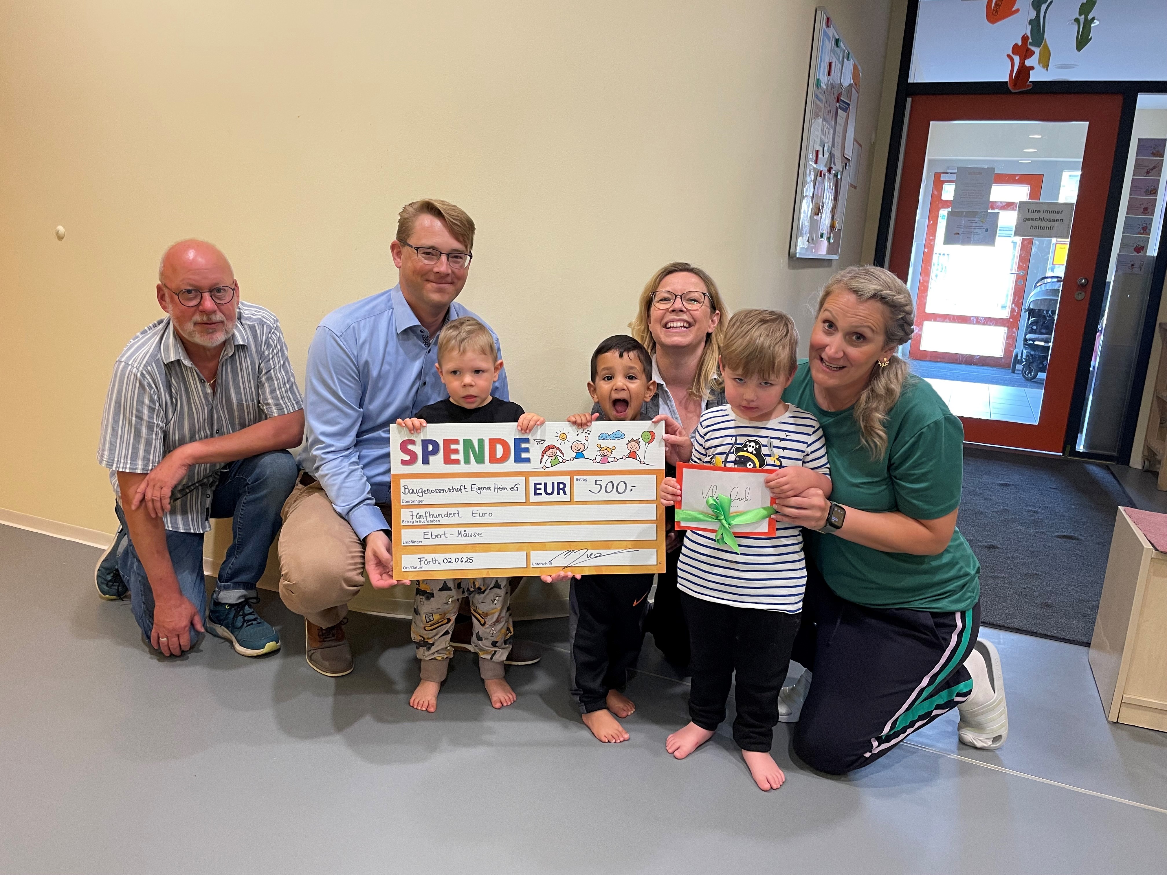 Am 02. Juni 2025 überreichte der geschäftsführende Vorstand, Herr Zierer, sowie Vorstand, Herr Weiskopf, eine Spende in Höhe von 500 € an die Kinderkrippe Ebert-Mäuse in der Friedrich-Ebert-Straße in Fürth. Stellvertretend entgegengenommen wurde der Scheck von der pädagischen Leitung, Frau Bauer (rechts im Bild), und der Kita-Koordinatorin, Frau …